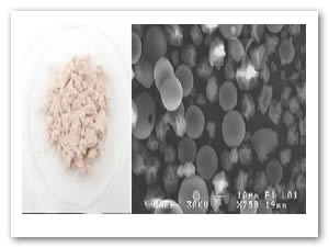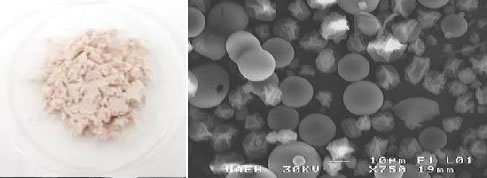 En la Figura 1 del lado izquierdo se observa el polvo obtenido tras el secado por aspersión, mientras que del lado derecho se muestra una micrografía de este polvo obtenido tras la microencapsulación con la maltodextrina. En esta última se puede observar cómo se formaron las capsulas del material, las cuales presentan una forma esférica de un tamaño que oscila entre 10 y 30 micras, de igual forma se observan partículas de forma irregular, que presentan una distribución de tamaño menor a las 10 micras, lo cual puede representar que las condiciones empleadas para la encapsulación o el material empleado para formar dichas cápsulas no fue el correcto.
