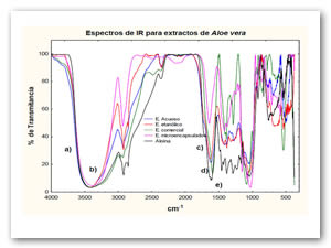 Figura 2. Espectros Infrarrojos de Aloe vera. a) OH (alcoholes, fenoles, ácidos), b) OH (fenolico), c) CO (cetonas, aldehídos, ácidos o esteres), d) CO (cetoenólico) y