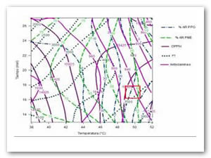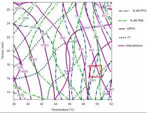 Los principales criterios para establecer el área óptima fue la reducción de la actividad enzimática de la PPO y la PME para evitar deterioros en la calidad del jugo, así como una alta capacidad antioxidante, un elevado contenido de fenoles totales y un alto contenido de antocianinas. Cabe mencionar que no se detectó crecimiento microbiano en ninguna de las muestras termoultrasonicadas con respecto al jugo fresco. Estos resultados no se ajustaron al modelo matemático, por lo que no se consideraron para la optimización. Como se puede apreciar en la figura 1, el área óptima de termoultrasonido se encontró a 50±1 ºC/17±1 min, obteniendo una inhibición mayor al 90 % de la PPO y 45 % de la PME, así como una alta capacidad antioxidante (16, 425 µmol ET/L), un elevado contenido de fenoles totales (3,500 mg EAG/L) y una alta concentración de antocianinas (940 mg Cy-3-Gl/L).