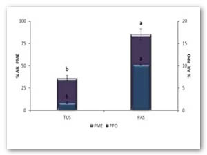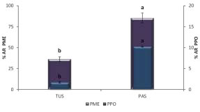 Figura 2. Comparación de la actividad residual (%AR) de las enzimas pectin metilesterasa (PME) y polifenol oxidasa (PPO) del jugo termoultrasonicado (TUS) y pasteurizado (PAS). a,b,cDiferentes letras indican diferencias significativas (p<0.05) entre tratamientos de acuerdo a la prueba de Tukey