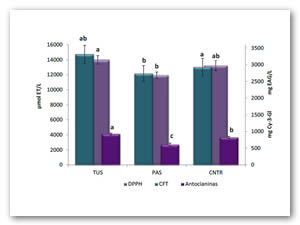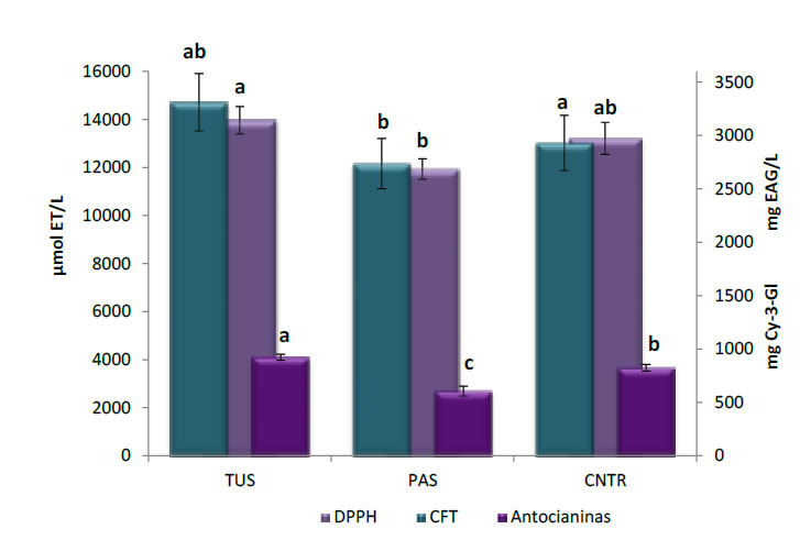 Figura 3. Comparación de la actividad antioxidante, contenido de fenoles totales (CFT) y antocianinas del jugo termoultrasonicado (TUS), pasteurizado (PAS) y control (CNTR). a,b,cDiferentes letras indican diferencias significativas (p<0.05) entre tratamientos de acuerdo a la prueba de Tukey