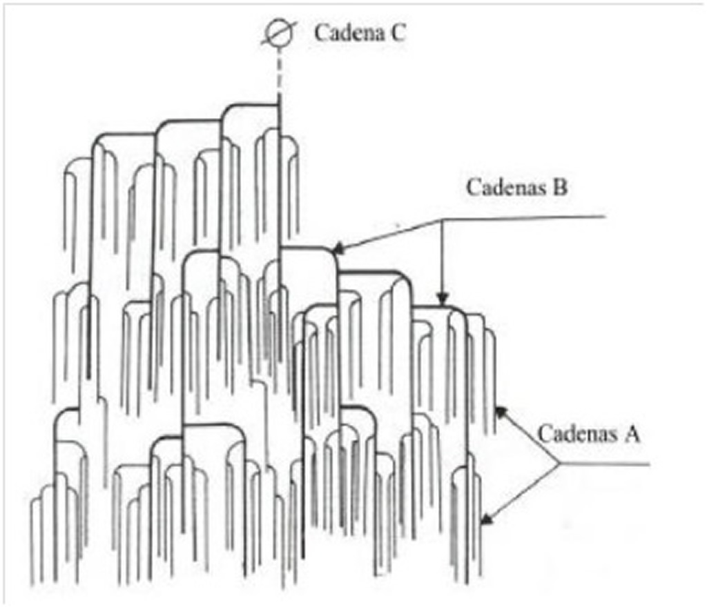 Mientras que la amilopectina (Figura 2) es un polímero ramificado con uno de los más altos pesos moleculares conocidos entre los polímeros que se encuentran naturalmente (Singh et al., 2003), es parcialmente soluble en agua caliente y en presencia de yodo produce un color rojizo violeta (Hernández et al., 2007). Esta molécula presenta ramificaciones en tres niveles; cadenas tipo A (ramificaciones no ramificadas a su vez), cadenas tipo B (ramificaciones que presentan otras ramificaciones) y cadena tipo C (solo existe una) es la cadena central ramificada pero que tiene un extremo inicial no parte de otra cadena (Ramirez, 2011).