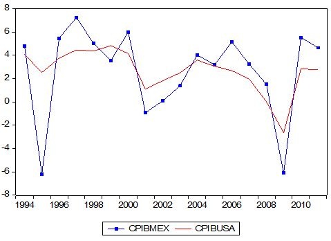 Figura 1. Crecimiento del PIB de México y EE. UU., 1994-2010 (porcentaje)