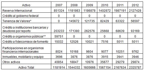 En los activos el rubro que más ha aumentado es el de reservas tanto en términos absolutos como en relativos entre 2007 y 2012; así de representar 72.03 por ciento de los activos en 2007 para 2012 representa 91.47 por ciento, lo que implicó un aumento de 1.49 veces la cifra de 2007 (cuadro 1).
