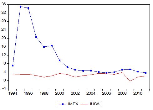 Figura 2. Inflación de México y de EE. UU., 1994-2010 (porcentaje)