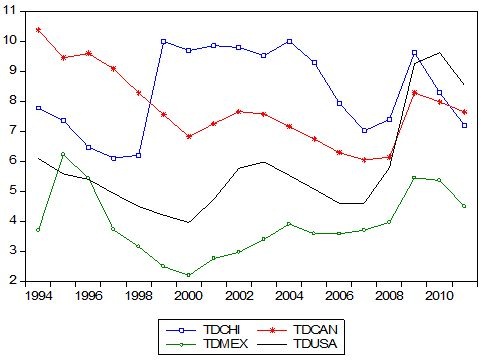 Figura 3. Tasa de desempleo de Chile, México, Canadá y EE. UU., 1994-2010 (porcentaje de la fuerza laboral)