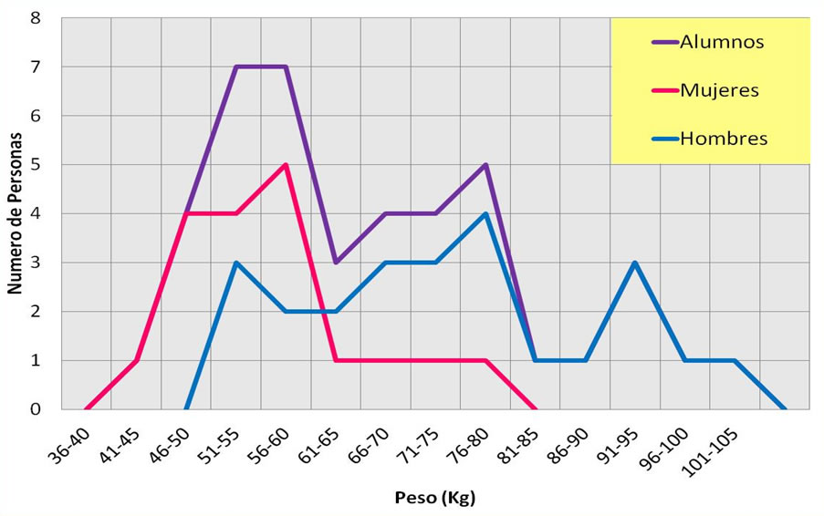 En el caso del peso, se observa una tendencia a formarse la campana de Gauss, no obstante cuando comienza a decrecer la curva esperada, vuelve a subir; esto indica que los estilos de vida como el sedentarismo y la mala alimentación, en parte de la población, han modificado los valores esperados, por lo que se tendrían que aislar a los alumnos con sobrepeso e infrapeso para determinar nuevamente los valores de umbral, aunque es evidente que este valor, inferior en mujeres, está por debajo de los 42.5Kg, y por encima de los 65Kg, mientras que para los hombres es de menos de 55Kg y más de 85 Kg. Esto indica que quienes sobrepasan estos valores, si no están acorde a su altura, estarían en infrapeso y sobrepeso respectivamente.