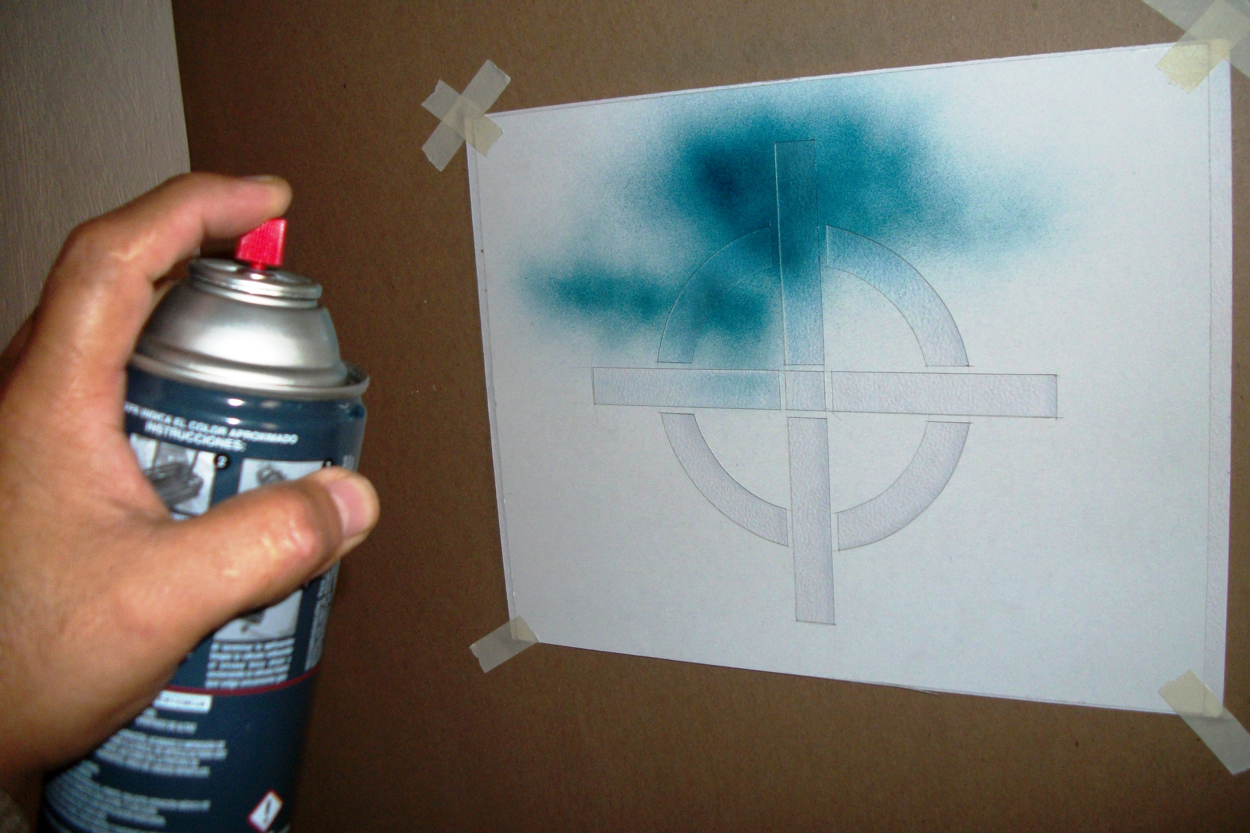 Paso 5.- Se procede a fijar la plantilla sobre los sustratos y se inicia la aplicación de la pintura en aerosol.