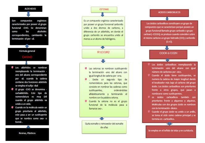 En el presente trabajó se realizó un esquema en donde se presentan las características principales, formulas generales, reglas de nomenclatura y usos de cada uno de los grupos funcionales, aldehídos, cetonas, ácidos carboxílicos, aminas, amidas, éteres y esteres, los cuales son los más importantes y representativos de la química orgánica.