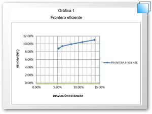 Este resultado brinda el primer portafolio dentro de la frontera eficiente el cual, representa el punto de menor riesgo posible de la inversión. El modelo se puede correr varias veces aumentado con cada corrida el parámetro de máximo riesgo a tolerar, lo que va a permitir hallar nuevos puntos o portafolios dentro de la frontera eficiente. (Ver gráfica 1).