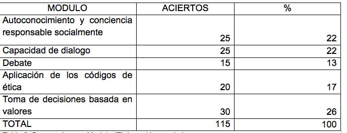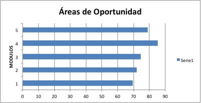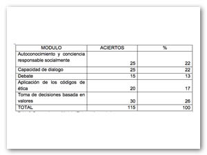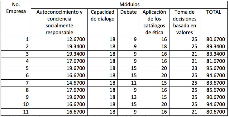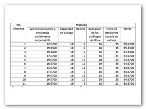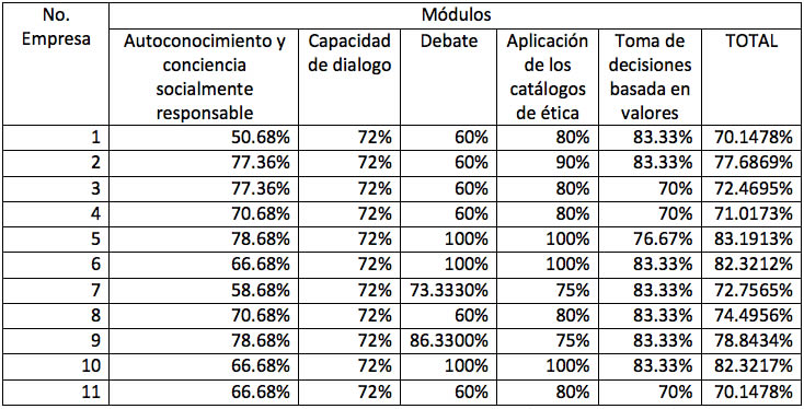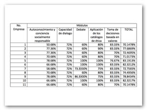 En promedio el modulo en donde se obtuvieron mejores resultados fue el de Aplicación de los Códigos de Ética (4) en donde los CEO´s obtuvieron 85.45% del total del modulo, seguido del modulo de toma de decisiones basada en Valores (5) con un 79.09% del total del modulo. El modulo que obtuvo el porcentaje más bajo de cumplimiento fue el correspondiente a autoconocimiento y conciencia socialmente responsable (1) con un 69.35% del total del modulo, el cual podría considerarse como área de oportunidad para los CEO´s.