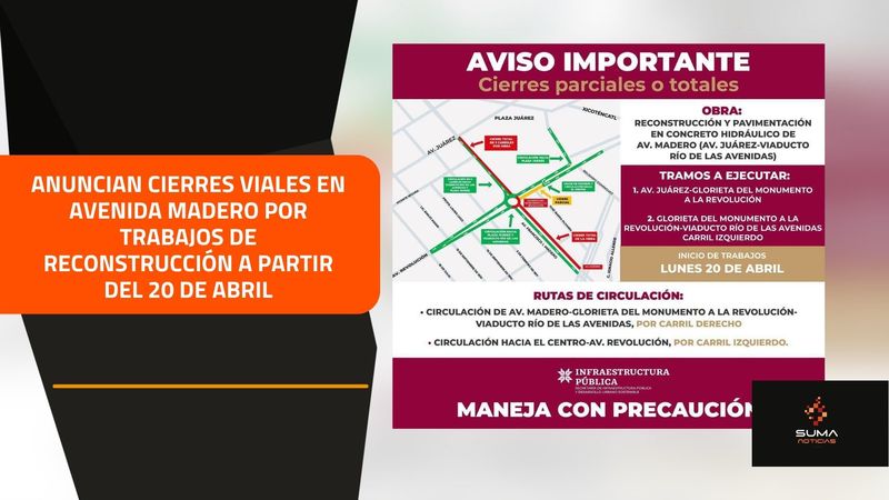 La Secretaría de Infraestructura Pública y Desarrollo Urbano Sostenible (SIPDUS) anuncia que, a partir de este lunes 20 de abril, se aplicarán nuevos cierres parciales y totales a la circulación derivados de los trabajos de reconstrucción y pavimentación en concreto hidráulico en la avenida Madero, tramo comprendido entre la avenida Juárez y el Viaducto Río de las Avenidas.